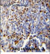 Immunohistochemical analysis in formalin fixed and paraffin embedded human lung carcinoma followed by peroxidase conjugation of the secondary antibody and DAB staining.