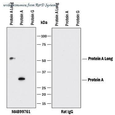 Detection of Protein A by Western Blot. Western blot shows Recombinant Protein A Long, Recombinant Protein A, and Recombinant Protein G (negative control). The left panel of the PVDF membrane was probed with 2 ╡g/mL of Rat Anti-Protein A Monoclonal Antibody (Catalog # MAB99761) followed by HRP-conjugated Anti-Rat IgG Secondary Antibody (Catalog # HAF005 ). A specific band was detected for Protein A at approximately 33 kDa and Protein A Long at approximately 55 kDa (as indicated). To show specificity, the right panel was probed with Anti-Rat IgG Antibody (negative control). This experiment was conducted under reducing conditions and using Immunoblot Buffer Group 1 .