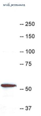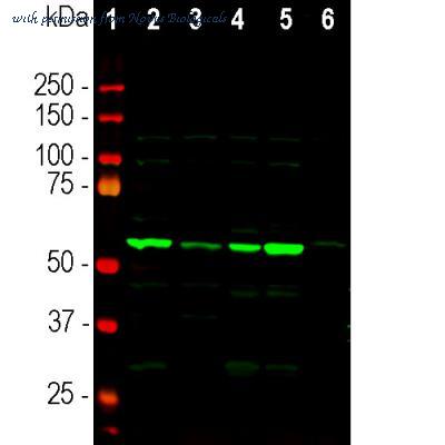 Western Blot: Coronin-1a Antibody [NB110-58867] - Western blot of HL60 Cell extract stained with RPCA-Cor1a, at dilution of 1:10,000. A prominent band running with an apparent SDS-PAGE molecular weight of ~57kDa corresponds to Coronin-1a. Numbers represent positions of molecular weight standards in kDa.