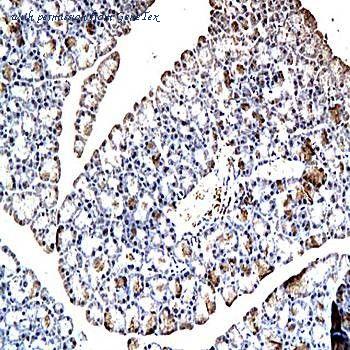 IHC-P analysis of rat pancreatic tissue using GIP antibody at a dilution of 1:200.