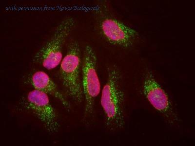 Immunocytochemistry/Immunofluorescence: LAMP-1/CD107a Antibody (6E2) [NBP2-25155] - HeLa cells stained with NBP2-25155 (green), and counterstained with a chicken polyclonal antibody to Lamin A + C (red) and DNA (blue). NBP2-25155 reveals strong cytoplasmic staining of lysosomes and early endosomes, while the Lamin A + C antibody binds to the nuclear lamina. Since both DNA (blue) and Lamin A + C (red) are associated with the nuclear compartment, this region appears crimson in this image.
