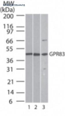 Western Blot: GPR83 Antibody [NBP2-24515] - Analysis of GPR83 in lysate from 1) human brain, 2) mouse brain, and 3) rat brain using GPR83 antibody at 0.5 ug/ml.