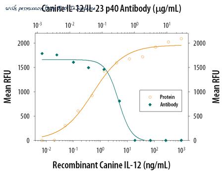 Cell Proliferation Induced by IL-12 and Neutralization by Canine IL-12/IL-23 p40 Antibody. Recombinant Canine IL-12 (Catalog # 2118-CL ) stimulates proliferation in PHA-activated human peripheral blood mononuclear cells (PBMC) in a dose-dependent manner (orange line). Proliferation elicited by Recombinant Canine IL-12 (25 ng/mL) is neutralized (green line) by increasing concen-trations of Goat Anti-Canine IL-12/IL-23 p40 Antigen Affinity-purified Polyclonal Antibody (Catalog # AF1969). The ND50 is typically 0.1-0.4 ╡g/mL.