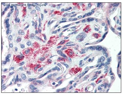 Immunohistochemistry analysis of human placenta tissue stained with Syntaxin 13, mAb (15G2) at 20µg/ml.