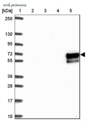 Western Blot: ACSM2A Antibody [NBP2-46841] - Lane 1: Marker [kDa] 250, 130, 95, 72, 55, 36, 28, 17, 10, Lane 2: Human cell line RT-4, Lane 3: Human cell line U-251 MG, Lane 4: Human plasma, Lane 5: Human Analysis of human liver tissue.