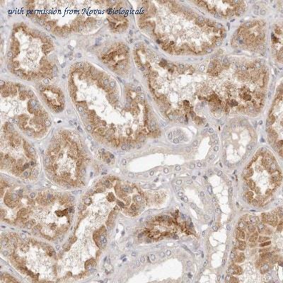 Immunohistochemistry-Paraffin: ADAMTS9 Antibody [NBP1-82915] - Staining of human kidney shows moderate cytoplasmic positivity in cells in tubules.