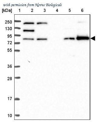 Western Blot: ANKRD13A Antibody [NBP2-38505] - Lane 1: Marker [kDa] 250, 130, 95, 72, 55, 36, 28, 17, 10. Lane 2: Human cell line RT-4. Lane 3: Human cell line U-251MG. Lane 4: Human Plasma. Lane 5: Human liver tissue. Lane 6: Human tonsil tissue