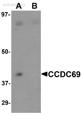 Western Blot: CCDC69 Antibody [NBP1-77145] - Mouse lung tissue lysate with CCDC69 antibody at 1 ug/ml in (A) the absence and (B) the presence of blocking peptide.