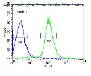 Flow cytometric analysis of HepG2 cells (right histogram) compared to a negative control cell (left histogram). FITC-conjugated goat-anti-rabbit secondary antibodies were used for the analysis.