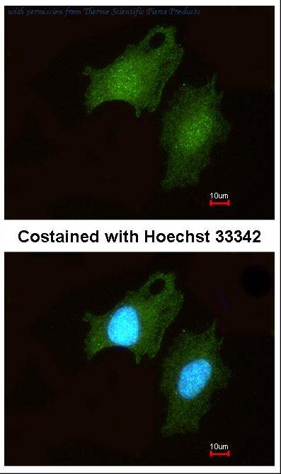 Immunofluorescence analysis of methanol-fixed HeLa cells using PA5-22089 anti-DIP2B antibody at 1:200 dilution.