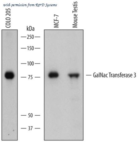 Detection of Human and Mouse Polypeptide GalNac Transferase 3/GALNT3 antibody by Western Blot.