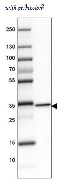 Western Blot: GDPD3 Antibody [NBP1-81081] - Lane 1: Marker [kDa] 250, 130, 100, 70, 55, 35, 25, 15, 10 Lane 2: Human cell line SK-BR-3