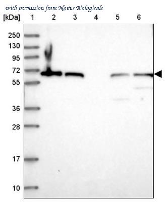 Western Blot: MON1B Antibody [NBP1-92131] - Lane 1: Marker [kDa] 250, 130, 95, 72, 55, 36, 28, 17, 10. Lane 2: Human cell line RT-4. Lane 3: Human cell line U-251MG sp. Lane 4: Human plasma (IgG/HSA depleted). Lane 5: Human liver tissue. Lane 6: Human tonsil tissue