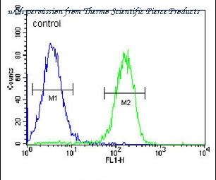 Flow cytometric analysis of MDA-MB435 cells (right histogram) compared to a negative control cell (left histogram). FITC-conjugated goat-anti-rabbit secondary antibodies were used for the analysis.