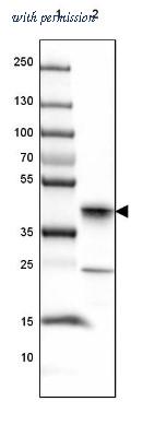Western Blot: JSRP1 Antibody [NBP1-81998] - Lane 1: Marker [kDa] 250, 130, 100, 70, 55, 35, 25, 15, 10 Lane 2: Human Skeletal muscle tissue