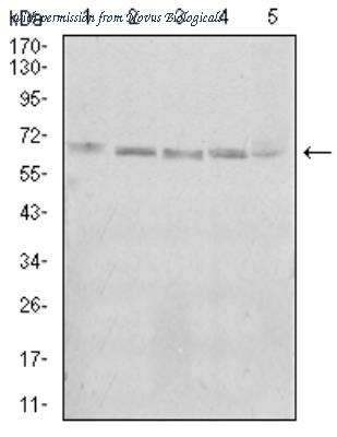 Western Blot: KBTBD8 Antibody (7G8A6) [NBP2-52496] - Analysis using KBTBD8 mouse mAb against A431 (1), Jurkat (2), Hela (3), K562 (4), and HEK293 (5) cell lysate.