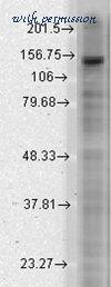 Western Blot of mouse anti-Slo2.1 antibody. Lane 1: Rat Brain Membrane lysate. Primary antibody: Slo2.1 antibody at 1:1000 for overnight at 4°C. Secondary antibody: Goat anti-mouse IgG HRP secondary antibody at 1:10,000 for 45 min at RT. Block: 5% Blotto overnight 4°C. Predicted/Observed size: 130.5kDa/140kD. Other band(s): none.