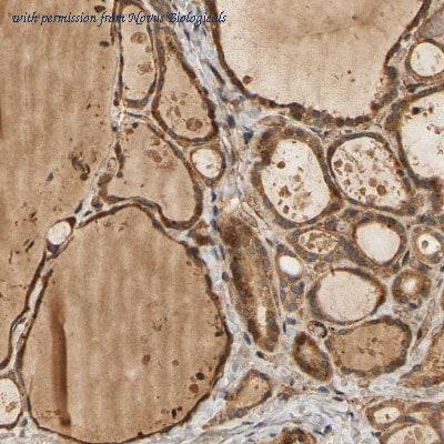 Immunohistochemistry-Paraffin: MEGF9 Antibody [NBP1-84886] - Staining of human thyroid gland shows strong cytoplasmic positivity in glandular cells.
