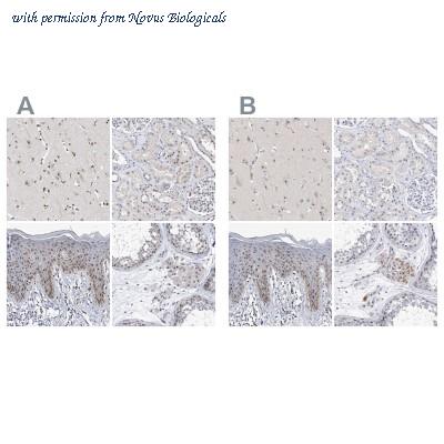 Immunohistochemistry-Paraffin: MPHOSPH10 Antibody [NBP1-84341] - Staining of human cerebral cortex, kidney, skin and testis using Anti-MPHOSPH10 antibody NBP1-84341 (A) shows similar protein distribution across tissues to independent antibody NBP2-38232 (B).