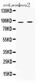 Western blot analysis of AKAP2 expression in rat cardiac muscle extract (lane 1) and HEPG2 whole cell lysates (lane 2). AKAP2 at 95KD was detected using rabbit anti-AKAP2 Antigen Affinity purified polyclonal antibody (Catalog # A09279) at 0.5 ug/mL. The blot was developed using chemiluminescence (ECL) method (Catalog # EK1002).