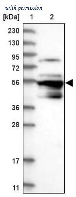 Western Blot: PCYOX1L Antibody [NBP1-81121] - Lane 1: Marker [kDa] 230, 130, 95, 72, 56, 36, 28, 17, 11 Lane 2: Human cell line RT-4
