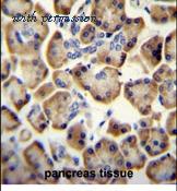 Immunohistochemical analysis in formalin fixed and paraffin embedded human pancreas tissue followed by peroxidase conjugation of the secondary antibody and DAB staining.