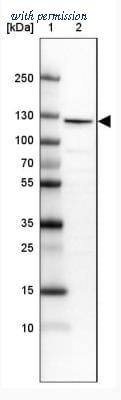 Western Blot: RBM25 Antibody [NBP1-83418] - Lane 1: Marker [kDa] 250, 130, 100, 70, 55, 35, 25, 15, 10 Lane 2: Human cell line MOLT-4