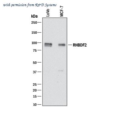Detection of Human iRHOM2/RHBDF2 antibody by Western Blot.