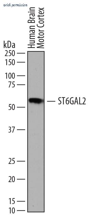 Detection of Human ST6 Gal Sialyltransferase 2/ST6GAL2 antibody by Western Blot.