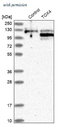 Western Blot: TOX4 Antibody [NBP1-88433] - Lane 1: Marker [kDa] 250, 130, 95, 72, 55, 36, 28, 17, 10. Lane 2: Negative control (vector only transfected HEK293T lysate). Lane 3: Over-expression lysate (Co-expressed with a C-terminal myc-DDK tag (3.1 kDa) in mammalian HEK293T cells).