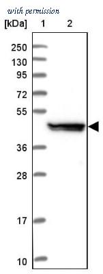 Western Blot: UAP1L1 Antibody [NBP1-92555] - Lane 1: Marker [kDa] 250, 130, 95, 72, 55, 36, 28, 17, 10. Lane 2: Human cell line RT-4