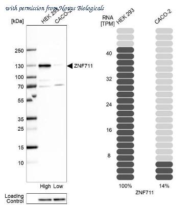 Western Blot: ZNF711 Antibody [NBP1-85538] - Analysis in human cell line HEK 293 and human cell line CACO-2.