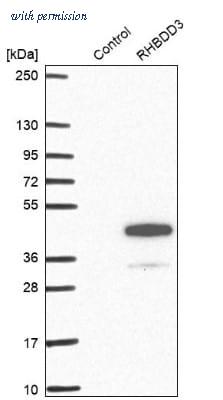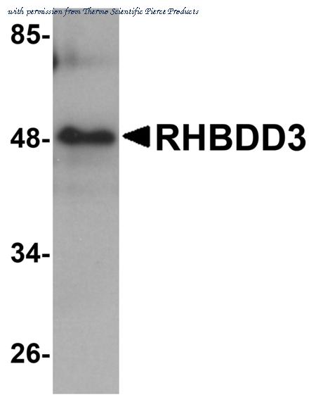 Western blot analysis of rat lung tissue lysate using PA5-20862 anti-RHBDD3 antibody at 1 ug/mL.
