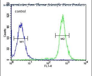 Flow cytometric analysis of 293 cells (right histogram) compared to a negative control cell (left histogram). FITC-conjugated goat-anti-rabbit secondary antibodies were used for the analysis.
