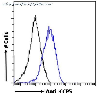 CCP5 antibody flow cytometric analysis of paraformaldehyde fixed NIH3T3 cells (blue line), permeabilized with 0.5% Triton. Primary incubation overnight (10ug/ml) followed by Alexa Fluor 488 secondary antibody (1ug/ml). IgG control: Unimmunized goat IgG (black line) followed by Alexa Fluor 488 secondary antibody.