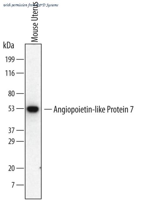 Detection of Mouse Angiopoietin-like Protein 7/ANGPTL7 antibody by Western Blot.