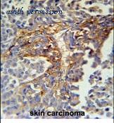 Immunohistochemical analysis in formalin fixed and paraffin embedded human skin carcinoma followed by peroxidase conjugation of the secondary antibody and DAB staining.