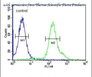 Flow cytometric analysis of 293 cells (right histogram) compared to a negative control cell (left histogram). FITC-conjugated goat-anti-rabbit secondary antibodies were used for the analysis.