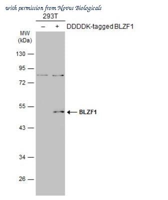 Western Blot: BLZF1 Antibody [NBP2-15596] - Non-transfected (-) and transfected (+) 293T whole cell extracts (30 ug) were separated by 10% SDS-PAGE, and the membrane was blotted with BLZF1 antibody diluted at 1:5000. The HRP-conjugated anti-rabbit IgG antibody (NBP2-19301) was used to detect the primary antibody.