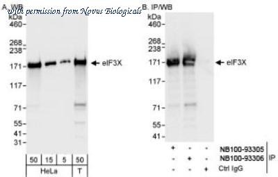 Western Blot: eIF3X Antibody [NB100-93306] - Samples: Whole cell lysate from HeLa (5, 15 and 50 mcg for WB; 1 mg for IP, 20% of IP loaded) and 293T (T; 50 mcg) cells. Antibody: Affinity purified rabbit anti-eIF3X antibody NB100-93306 used for WB at 0.04 mcg/ml (A) and 1 mcg/ml (B) and used for IP at 3 mcg/mg lysate. eIF3X was also immunoprecipitated by rabbit anti-eIF3X antibody NB100-93305, which recognizes an upstream epitope. For blotting immunoprecipitated eIF3X, the ReliaBLOT (R) Reagents and Procedures (Cat. No. WB120) were used. Detection: Chemiluminescence with exposure times of 3 seconds (A) and 1 second (B).