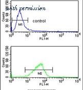 Flow cytometry analysis of K562 cells (bottom histogram) compared to a negative control cell (top histogram). FITC-conjugated goat-anti-rabbit secondary antibodies were used for the analysis.