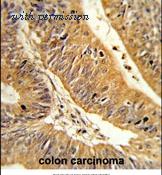 Immunohistochemical analysis in formalin-fixed and paraffin-embedded human colon carcinoma followed by peroxidase-conjugated to the secondary antibody, followed by DAB staining.