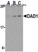 Western Blot: DAD1 Antibody [NBP1-77197] - Analysis of DAD1 in HepG2 cell lysates with anti-DAD1 using this antibody at (A) 0.5, (B) 1, and (C) 2 ug/ml.