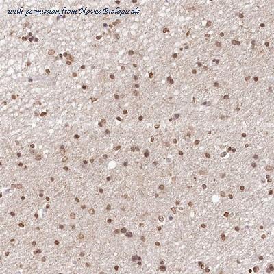 Immunohistochemistry-Paraffin: DMXL1 Antibody [NBP1-90998] - Staining of human hippocampus shows moderate nuclear positivity in glial cells.