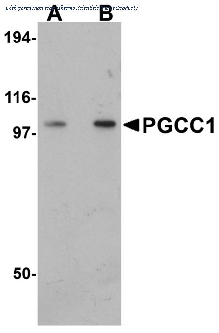 Western blot analysis of PGCC1 in rat thymus tissue lysate with PGCC1 antibody at (A) 0.5 and (B) 1 ug/mL.