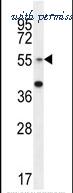 Western blot analysis of GCNT3 in mouse NIH-3T3 cell line lysates using 35ug per lane of antibody.