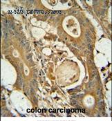 Immunohistochemical analysis in formalin fixed and paraffin embedded human colon carcinoma followed by peroxidase conjugation of the secondary antibody and DAB staining.