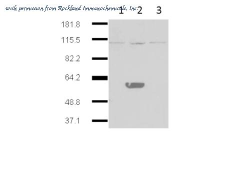 Western Blot of Mouse Anti-IDO2 antibody. Lane 1: HEK293 no transgene cell extracts. Lane 2: mouse IDO-2 transgene expressed in 293HEK. Lane 3: mouse IDO-1 transgene expressed in 293HEK. Primary antibody: IDO2 monoclonal Antibody. Secondary antibody: IRDye800™ mouse secondary antibody at 1:10,000 for 45 min at RT. Block: 5% BLOTTO overnight at 4°C. Predicted/Observed size: 44.4 kDa, ~60 kDa for IDO 2. Other band(s): IDO2 splice variants and isoforms.