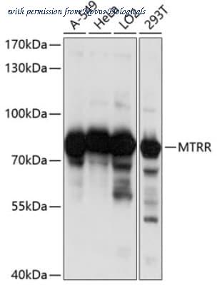 Western Blot: MTRR Antibody [NBP2-93732] - Analysis of extracts of various cell lines, using MTRR at 1:1000 dilution. Secondary antibody: HRP Goat Anti-Rabbit IgG (H+L) at 1:10000 dilution. Lysates/proteins: 25 ug per lane. Blocking buffer: 3% nonfat dry milk in TBST. Detection: ECL Basic Kit. Exposure time: 20s.