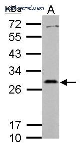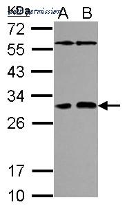 Western Blot analysis using anti-PAFAH1B2 Polyclonal Antibody on the following cells: (30 ug of whole cell lysate) A: NIH-3T3 B: JC. Primary antibody (PA5-31152) diluted at 1:2000